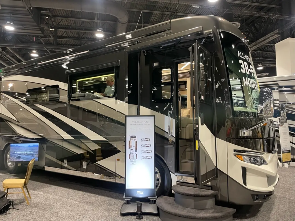 The Mountain Aire 3823 motorhome features a new rear bedroom mid-bathroom layout with quad slides. It comes with a standard 10.0 kW generator, and there’s an all-electric option available this year.