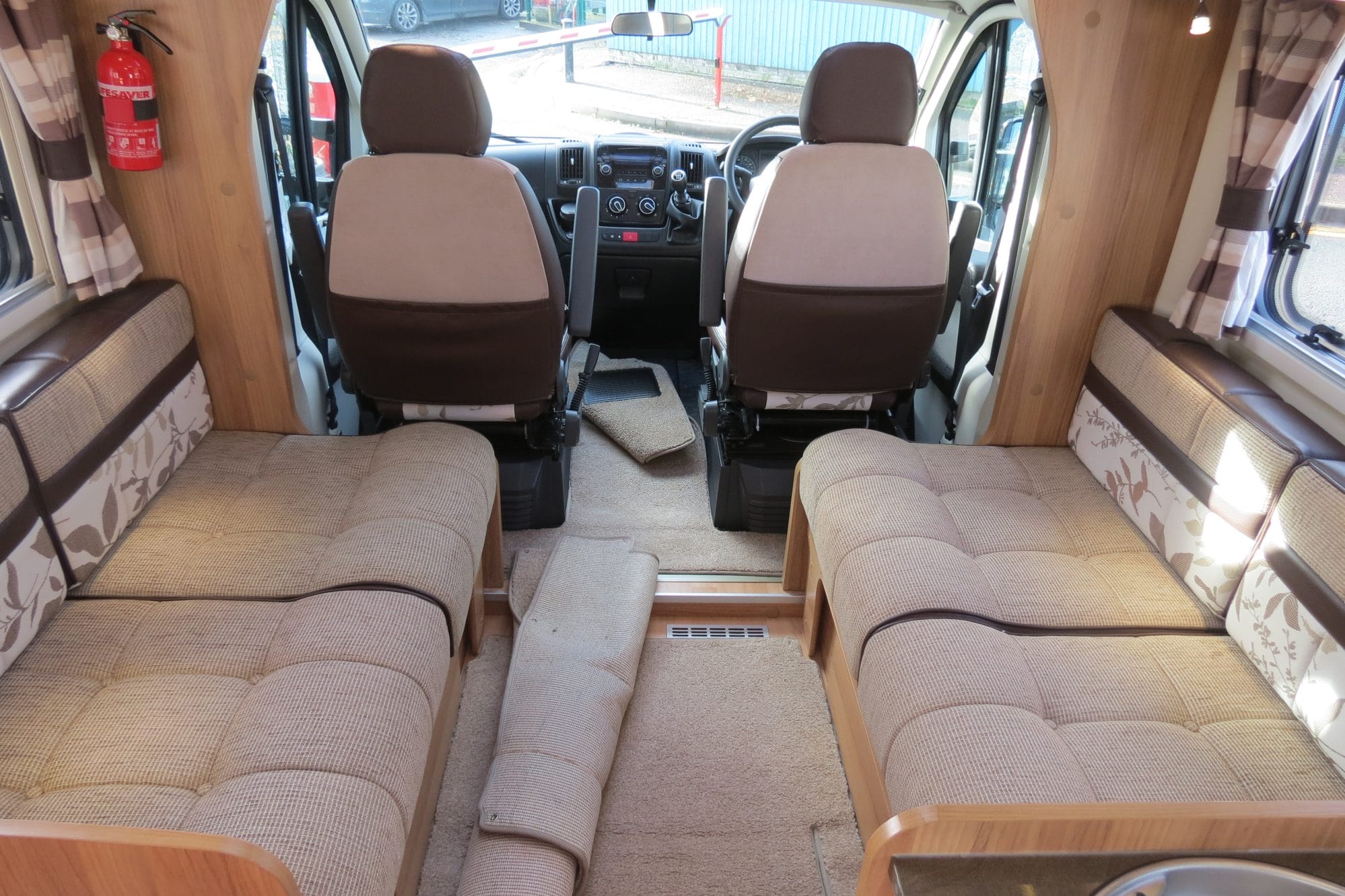 Up front, bench sofas plus swivel cab seats create a sociable lounge that’s bright and inviting, good for dining or relaxing.