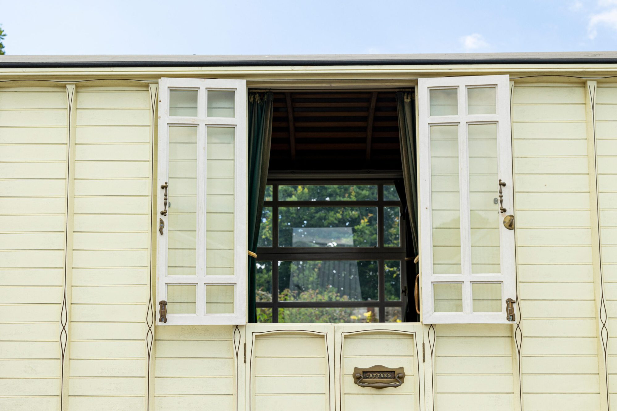 Its body was created by Dunton of Reading, whose history began in the horse-drawn carriage era. There’s a mail slot near the door, slatted windows, and doors.