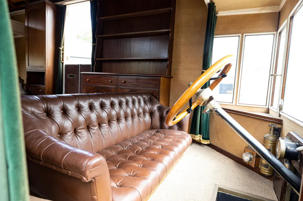 There are four berths in the rear, with a wood-burning cast-iron stove behind the cab for heating and cooking food. There’s ample storage in the wooden welsh-style dresser.
